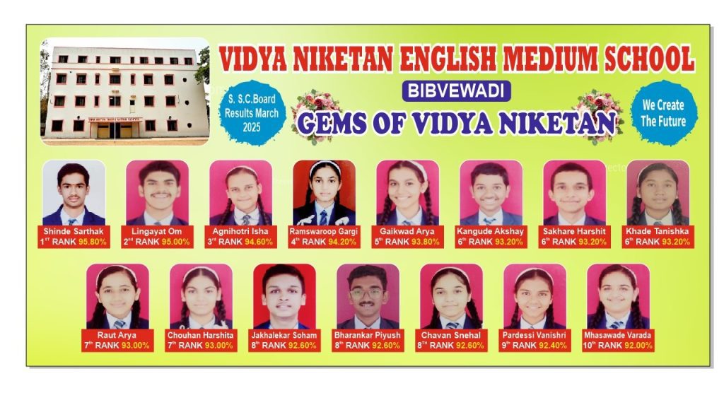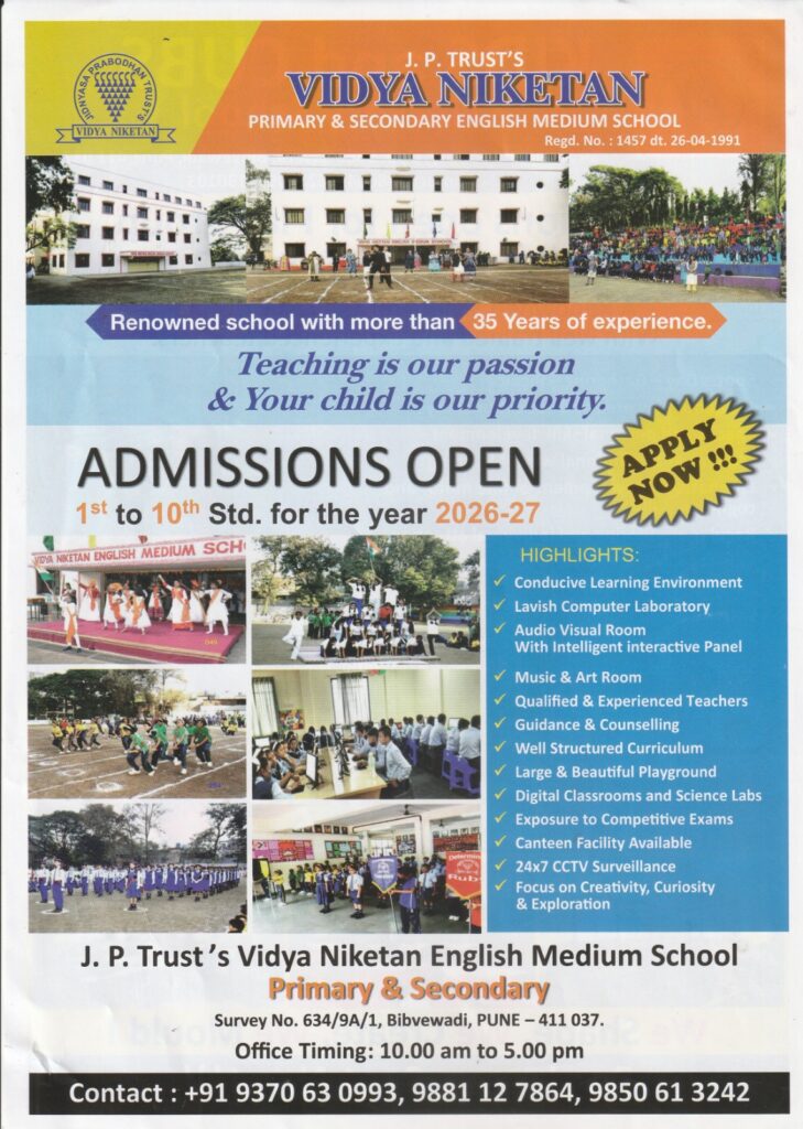 J.P.Trust’s Vidya Niketan School was established in 1991 with just five students. The Foundation Stone for Primary was laid in 1991 and every subsequent year a class was added. The first batch of SSC passed out with full glory in March 2000 with a creditable 100% result.